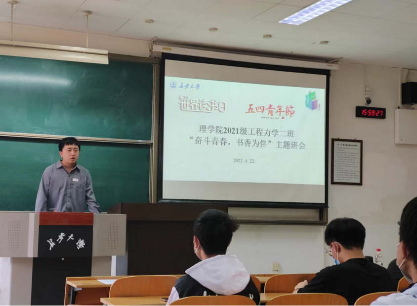 在世界读书日和五四青年节来临之际,为了进一步提高学生文化素养,培养良好的学风班风,建设积极向上、健康文明的校园文化氛围,鼓励学生以书为友,养成良好的读书习惯。4月21日下午,必赢242net官网2021级工程力学二班在渭水校区明远1213召开“奋斗青春·书香为伴”主题班会。学院党委书记闫永刚、团委书记刘延海、班主任拓宏亮和工程力学二班全体同学参加了本次班会,班会由拓宏亮主持。