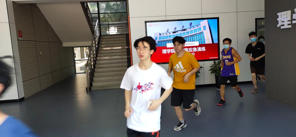 本次演练活动以实验室突发应急安全事件为模拟背景,演练内容主要是师生在紧急情况下的疏散撤离和处突组织能力,演练时间随机选定。上午10:50,假想实验室突发应急事件,安全员立即吹哨示警,并利用喇叭提示大楼内师生立即有序撤离。正在进行实验课教学的师生分别从大楼一层、四层、五层教室撤离,从就近逃生通道有序疏散,快速通过大楼门厅至楼前空地集合并清点人数,参加演练师生全部安全撤离仅用时1分50秒,演练活动取得圆满成功。